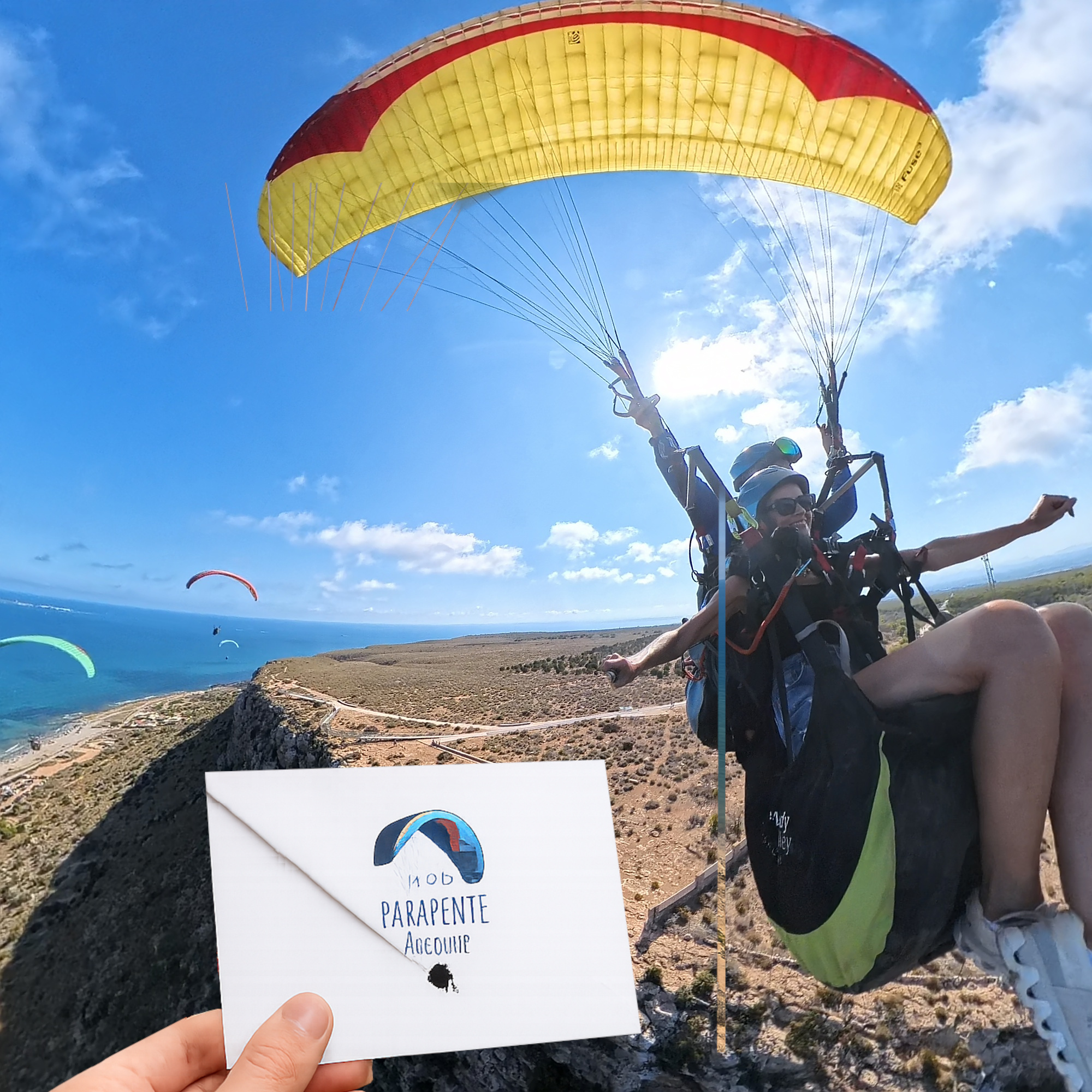 Bono regalo físico + PDF para un vuelo en parapente biplaza en Santa Pola o Alicante, con fotos y vídeos GoPro 12 incluidos. Más de 450 reseñas 5 estrellas y 24 años de experiencia. Envío gratis y entrega digital en 24 h.